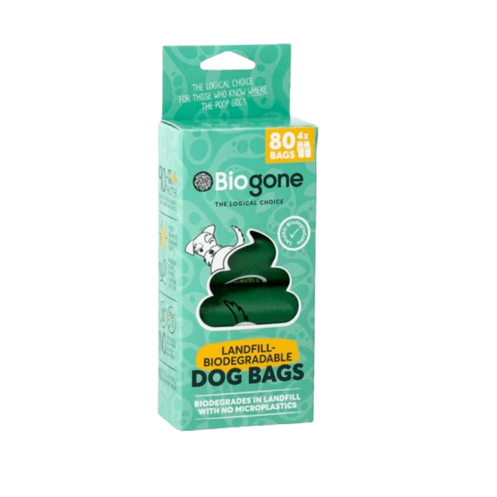 Biogone Biodegradable Bags come in a pack of 4 rolls, totaling 80 bags. These bags are designed to biodegrade in commercial and municipal composts, making them an environmentally friendly choice for pet owners. They are non-hazardous to birds and small animals and won't fragment into small pieces .