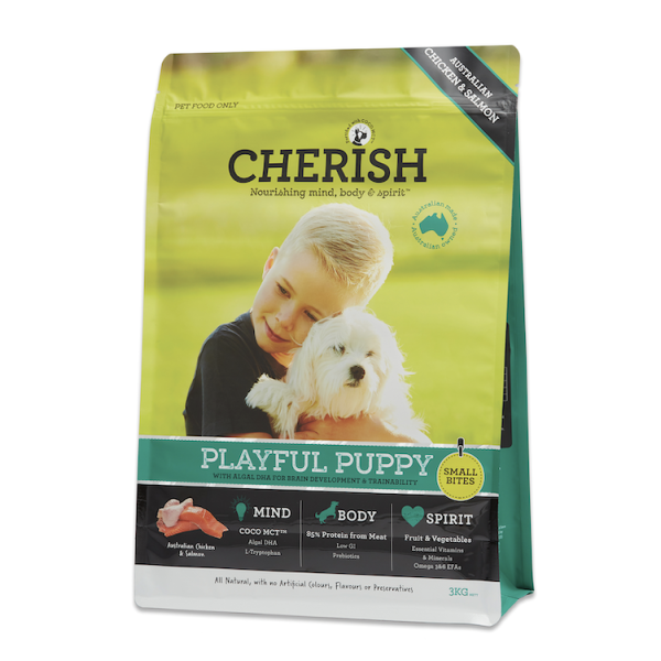 Cherish Playful Puppy Small Bites are crafted for young, active dogs. Packed with chicken protein and DHA, it supports muscle growth, brain, and vision development.