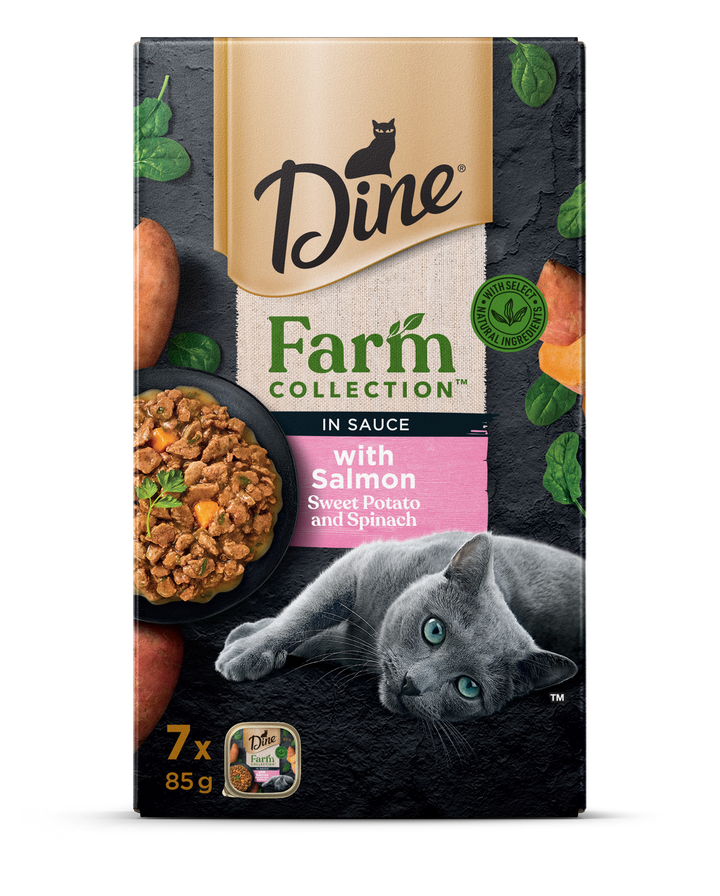 Dine Farm Collection Salmon, Sweet Potato & Spinach combines real salmon protein with wholesome vegetables. Rich in omega fatty acids, it supports skin and coat health, while sweet potato and spinach add fiber and natural vitamins. The moist recipe also provides hydration for overall well-being.
