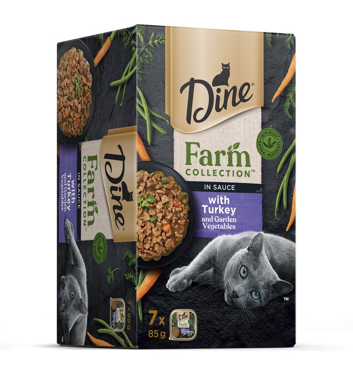 Dine Farm Collection Turkey with Garden Vegetables pairs real turkey with carrots and spinach for a wholesome meal. Protein supports muscles, while the vegetables add natural fiber and vitamins. The moist texture supports hydration and mealtime enjoyment.