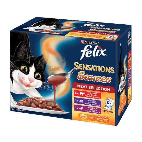Felix Sensations Sauces Meat Selection offers meaty recipes in rich sauces for hydration and taste. With protein for muscle health, taurine for heart and vision, and balanced vitamins, it’s a delicious complete diet for adult cats.