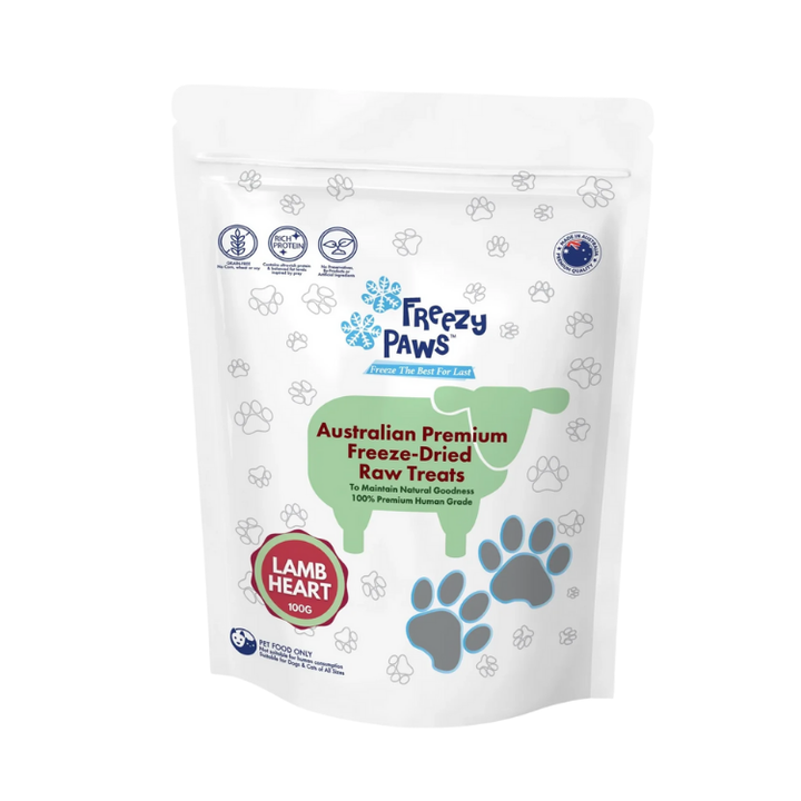 Freezy Paws Freeze Dried Lamb Heart treats are crafted from 100% natural lamb hearts, offering a protein-rich snack that supports muscle development and overall health. Lamb heart is also a good source of taurine, an amino acid beneficial for heart health. The freeze-drying process preserves essential nutrients and natural flavors, ensuring a wholesome treat for your pet.