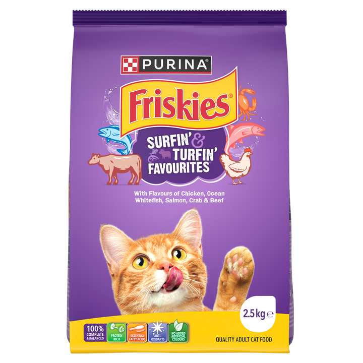 Friskies Adult Surf’n’Turf Favorites offers a mix of seafood and poultry proteins for variety and balance. With essential amino acids, taurine, and omega fatty acids, it supports muscle, heart, vision, and coat health. Crunchy kibble also helps clean teeth.