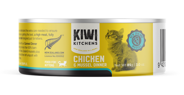 Kiwi Kitchens Kitten Chicken and Mussels provides growing kittens with free-range chicken for protein and New Zealand green-lipped mussels for natural omega oils. DHA supports brain and eye development, while taurine helps maintain a healthy heart. Grain free and gentle, it’s made for healthy growth.