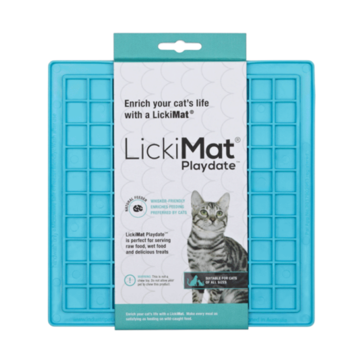 The LickiMat Cat Classic Playdate in Turquoise is a slow-feeding mat designed to enrich your cat's mealtime. Its square-patterned surface encourages licking, which can help reduce anxiety and boredom while promoting slower eating for better digestion. Made from non-toxic, food-grade TPR, it's suitable for various types of food and treats.