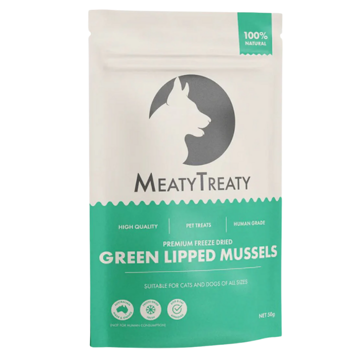 Meaty Treaty Freeze Dried Green Lipped Mussels are a natural source of Omega-3 fatty acids, which support joint health, reduce inflammation, and promote a shiny coat. They also contain glucosamine and chondroitin, known for supporting joint function and mobility. The freeze-drying process preserves the nutrients and natural flavors, ensuring a wholesome treat for your pet.