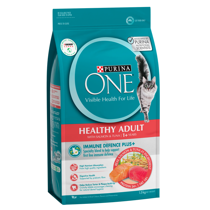 Purina ONE Adult Salmon & Tuna delivers premium fish proteins for muscle health and energy. Omega-3 fatty acids support skin, coat, and joint health. Taurine aids heart and vision, while antioxidants support immunity.