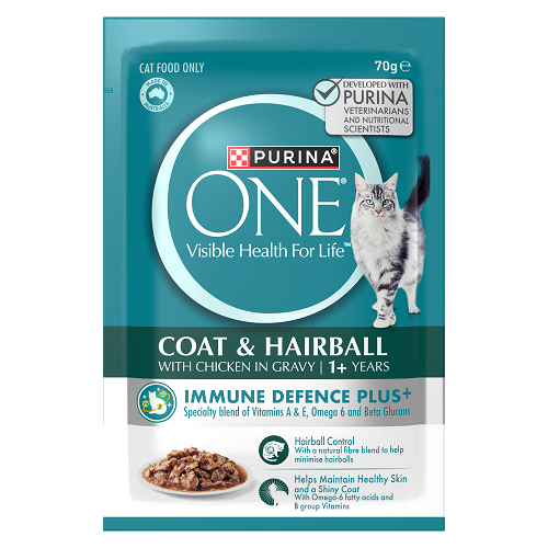 Purina ONE Hairball Control Chicken Pouches use real chicken for lean muscle support and add natural fiber to help reduce hairball build-up. Taurine supports heart and eye health, while the moist texture helps with daily hydration. It’s a balanced, easy-to-digest meal for adult cats.