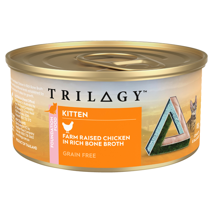 Trilogy Kitten Chicken in Bone Broth is crafted for growing kittens with real chicken protein and nourishing bone broth. Chicken provides amino acids for muscle growth, while the broth delivers collagen and hydration for digestive and joint support. DHA and taurine support brain, vision, and heart development.