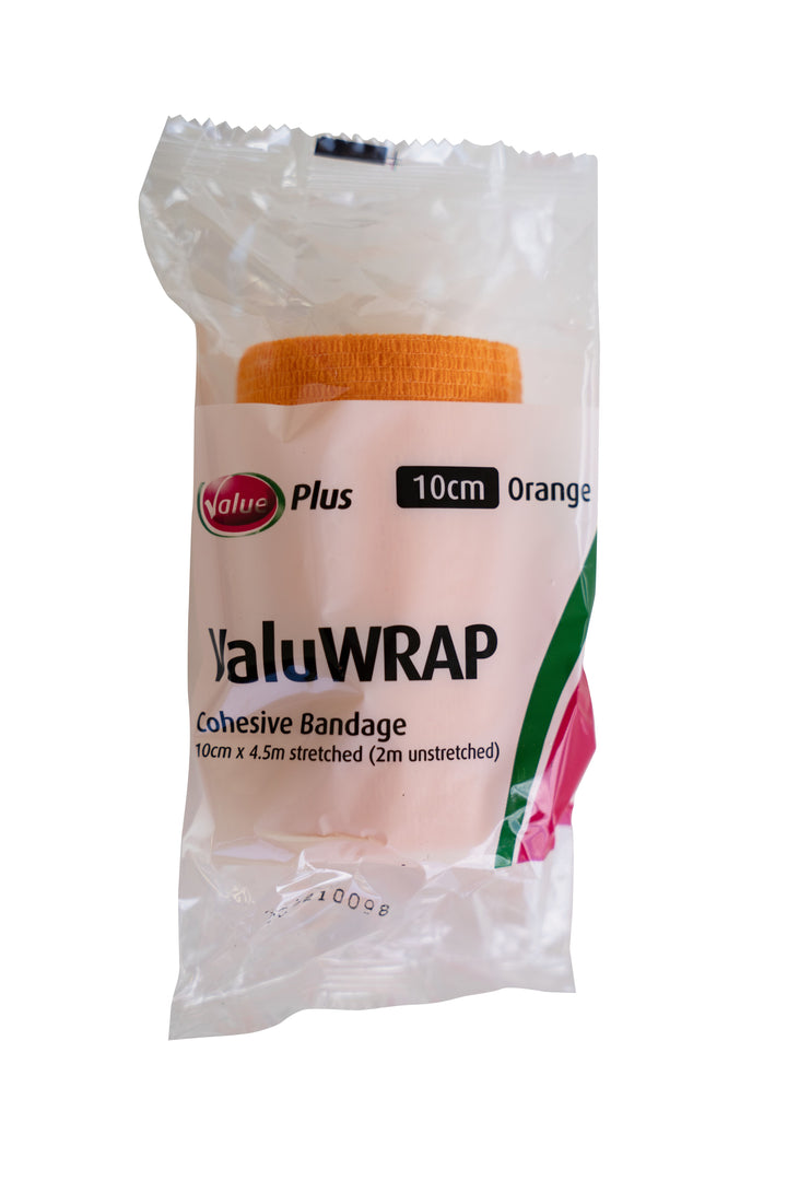 ValuWrap Cohesive Bandage 10cm Orange is a versatile and durable bandage designed for wound care. This self-adhering bandage is ideal for securing dressings and providing light compression on injuries.