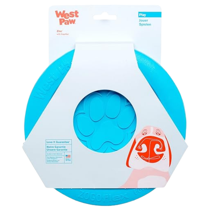 The West Paw Zisc in Large Aqua is a high-flying disc designed for gentle chewers. Made from soft, pliable Zogoflex® material, it's gentle on dogs' mouths and easy to grip. This lightweight disc floats in water and doubles as a travel bowl when flipped over.